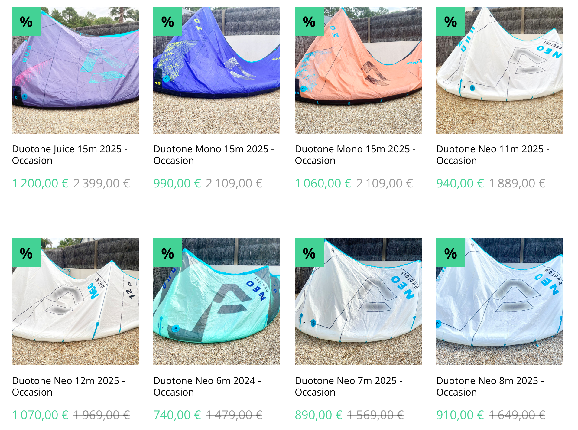 Tout le matériel est intégralement révisé par nos soins (coutures, pression dans les lattes, bridages, lignes, réglages, accastillages…) et est donc vendu en parfait état de fonctionnement, prêt à être utilisé. Les prix sont établis en fonction du nombre de sorties du matériel, de l’état général ainsi que des éventuelles petites réparations. Notre équipe restera à votre disposition pour tout conseil ou réglage dont vous pourriez avoir besoin.
