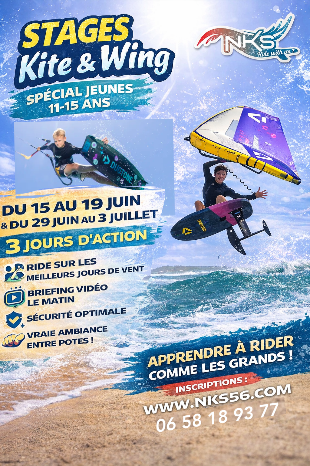 NKS Kite & Wing lance 2 sessions de stage 100% dédiées aux 11-15 ans, pour découvrir ou progresser en kitesurf et wingfoil dans un cadre sécurisé, fun et ultra motivant.